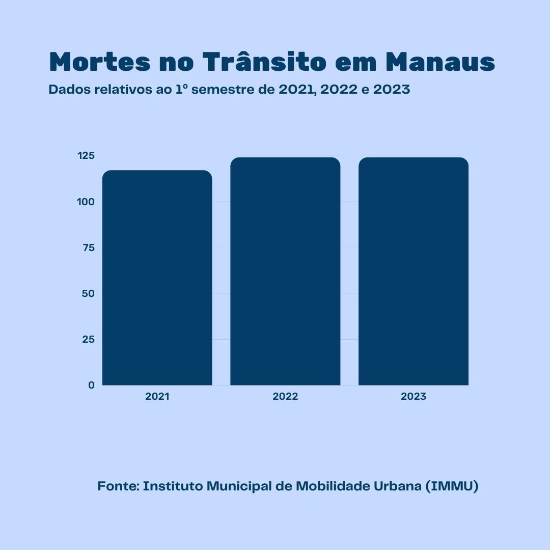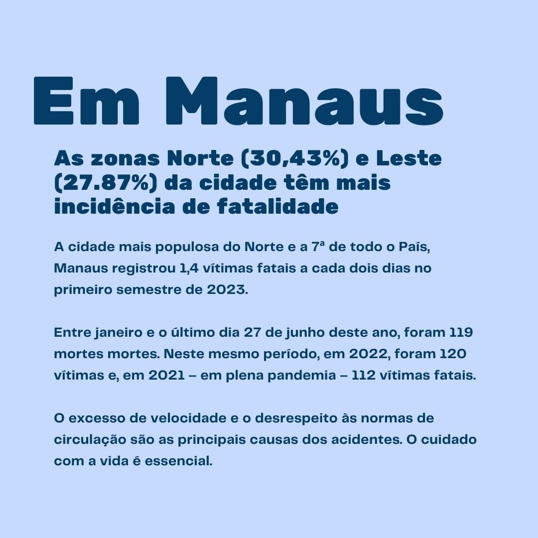 A capital mais populosa do Norte e a 7ª de todo o País, Manaus registrou 1,5 vítima fatal a cada dois dias no primeiro semestre de 2023, em decorrência de acidente de trânsito. Entre janeiro e o último dia 27 de junho deste ano, foram 119 mortes, com mais casos nas zonas Norte (30,43%) e Leste (27.87%) da cidade. Os números são da Prefeitura de Manaus, por meio do Instituto Municipal de Mobilidade Urbana (IMMU).