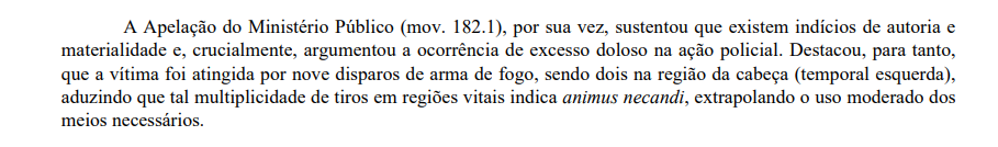 “A Apelação do Ministério Público (mov. 182.1), por sua vez, sustentou que existem indícios de autoria e materialidade e, crucialmente, argumentou a ocorrência de excesso doloso na ação policial. Destacou, para tanto, que a vítima foi atingida por nove disparos de arma de fogo, sendo dois na região da cabeça (temporal esquerda), aduzindo que tal multiplicidade de tiros em regiões vitais indica animus necandi, extrapolando o uso moderado dos meios necessários“, diz um trecho do documento.