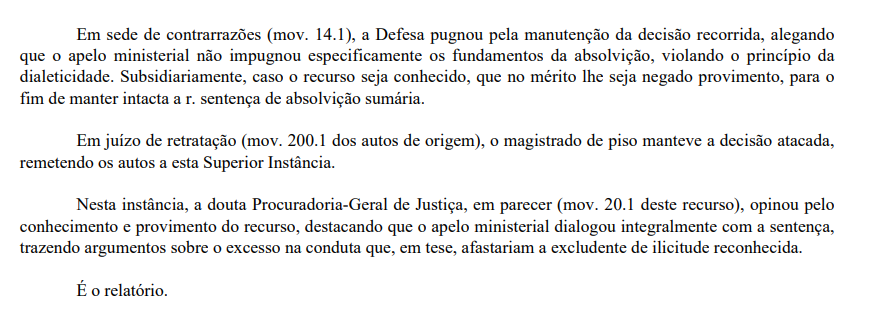 “A defesa pugnou pela manutenção da decisão recorrida, alegando que o apelo ministerial não impugnou especificamente os fundamentos da absolvição, violando o princípio da dialeticidade. Subsidiariamente, caso o recurso seja conhecido, que no mérito lhe seja negado provimento, para o fim de manter intacta sentença de absolvição sumária“, diz um trecho da decisão.