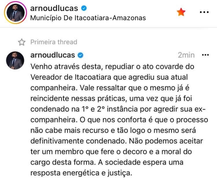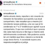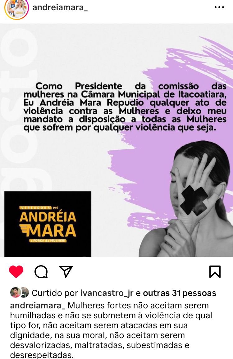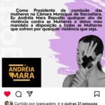 “Como Presidente da comissão das mulheres na Câmara Municipal de Itacoatiara, euAndréia Mara repudio qualquer ato de violência contra as mulheres e deixo meu mandato à disposição a todas as mulheres que sofrem por qualquer violência que seja”, escreveu Andréia Mara.