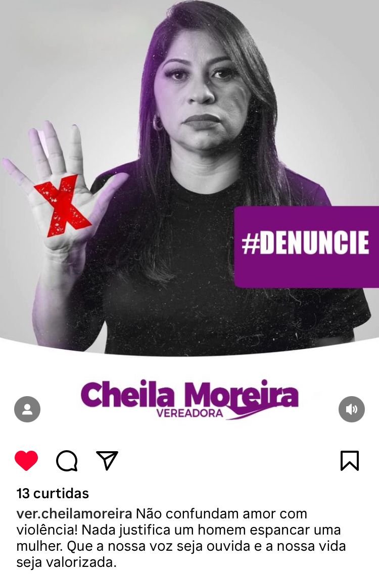 A vereadora Cheila Moreira (PT) reforçou que nada justifica um homem agredir a mulher. Nas redes sociais, a parlamentar deixou um recardo. “Não confundam amor com violência! Nada justifica um homem espancar uma mulher. Que a nossa voz seja ouvida e a nossa vida seja valorizada”, disse.